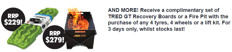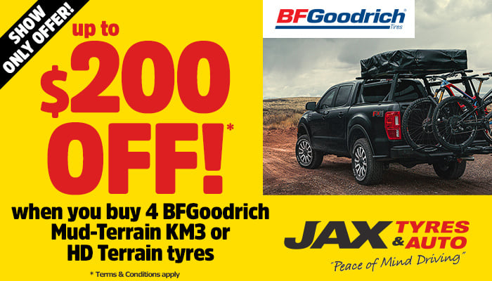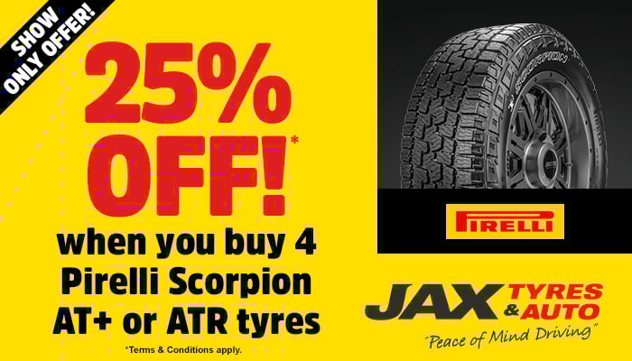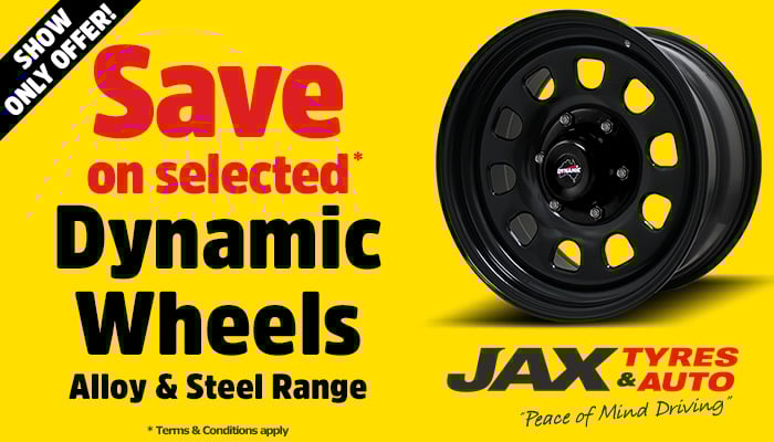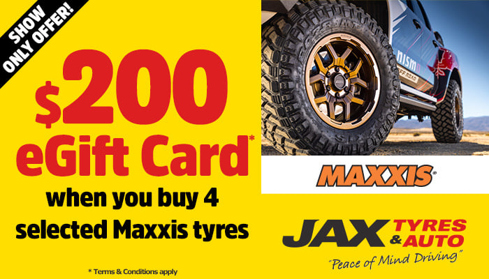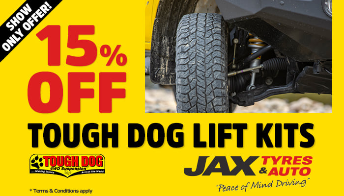 The following Show Offers are available at the JAX Tyres & Auto Stand EB116 during the National 4x4 Outdoors Show Brisbane 2026.